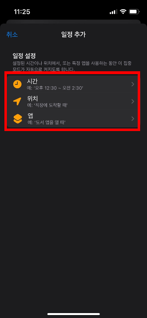 11. 원하는 시간, 위치, 앱 등을 지정해 줍니다.