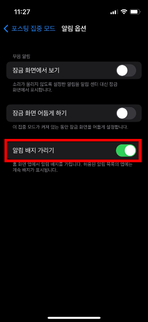 12. 옵션 > 알림 배지 가리기를 비활성화하면 집중모드 설정 중에는 알림 배지도 가려줍니다.
