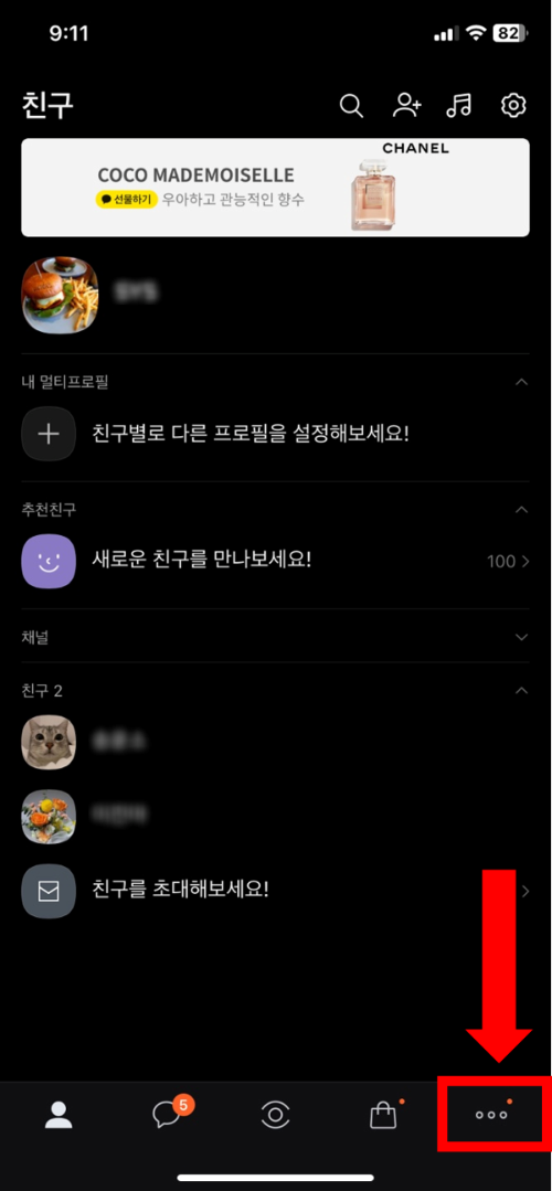 1. 카카오톡을 실행 후 우측 하단의 더보기 [···]를 탭해 줍니다.