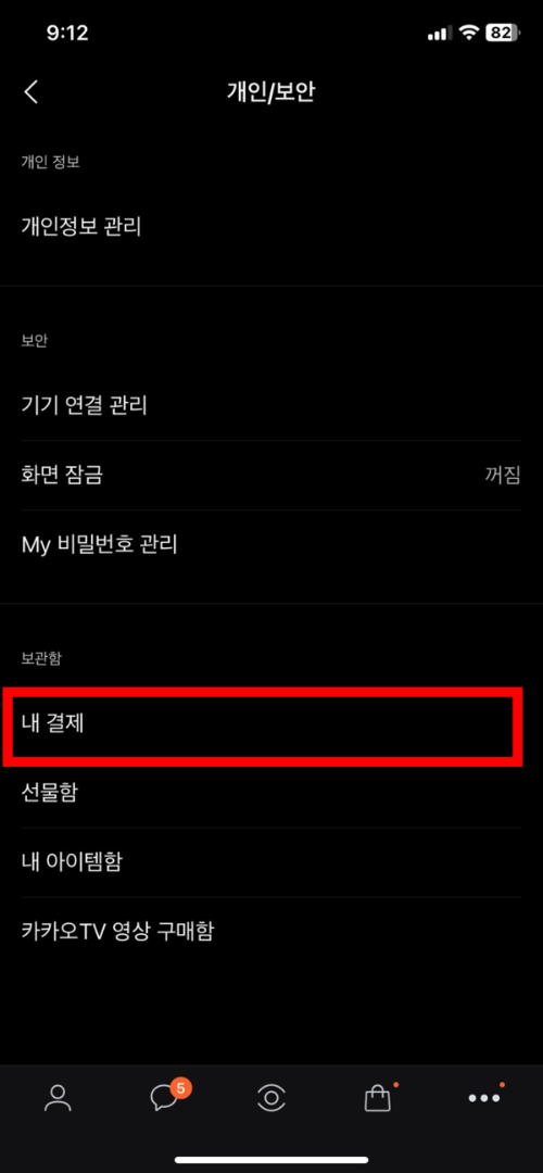 4. 개인/보안 화면에서 [내 결제]를 탭 해 줍니다.