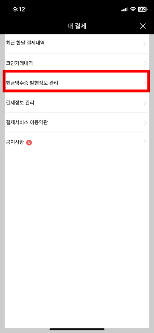 5. 내 결제 화면에서 [현금영수증 발행정보 관리]를 탭 해 줍니다.