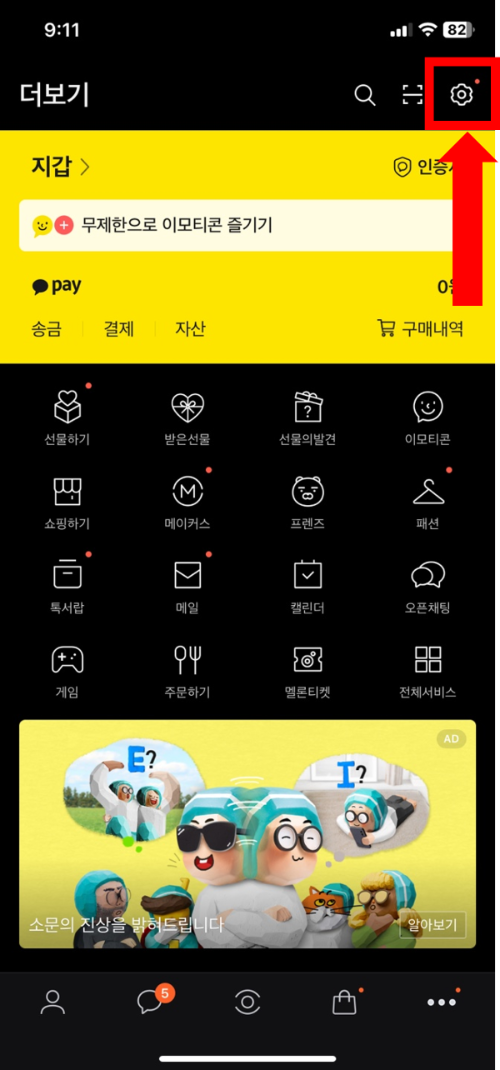 2. 더 보기 화면에서 우측 상단의 [설정] 아이콘을 탭 해 줍니다.