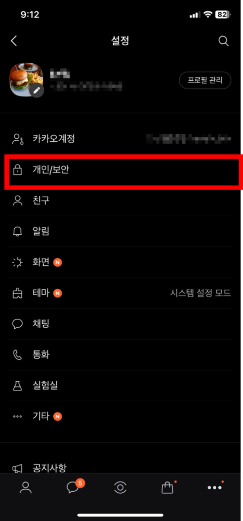 3. 설정화면에서 [개인/보안]을 탭 해 줍니다.