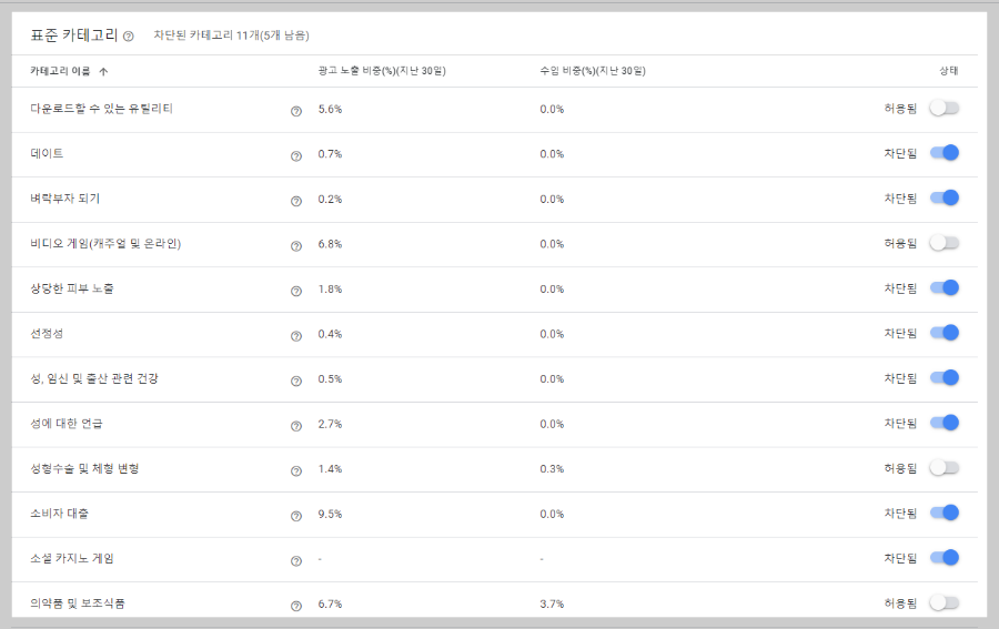민감한 카테고리에서는 특히 선정적인 광고들을 차단하기 위해서 상당한 피부 노출, 선정성, 성에 대한 언급, 성·임신 및 출산 관련 건강 항목들의 슬라이드를 클릭해서 허용됨 > 차단됨으로 변경해 주시면 됩니다.