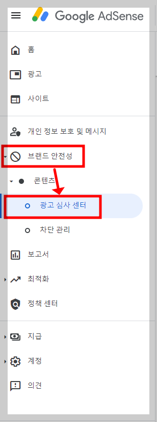목록 중에서 브랜드 안전성 > 콘텐츠 > 광고심사센터 순서로 클릭해 줍니다.
