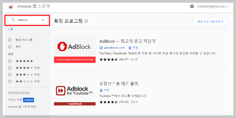 크롬 웹스토에서 adblock을 검색해 주면 광고 차단 프로그램이 여러개 나옵니다.