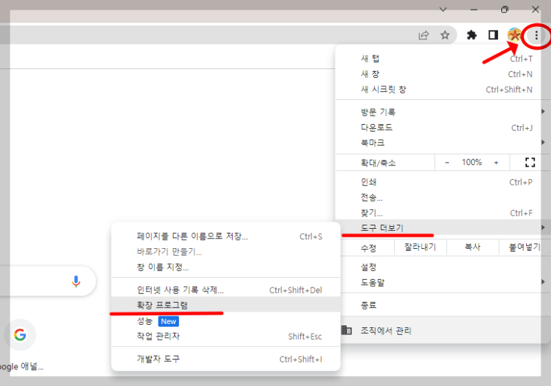 크롬 브라우저를 열고 우측 상단의 점 세개 > 도구 더보기 > 확장프로그램 순으로 클릭해 줍니다.