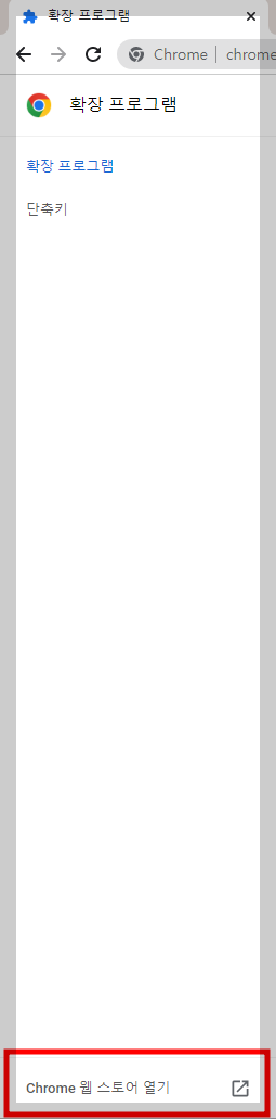 확장프로그램 창이 열리고 하단에 보면 크롬 웹스토어 열기를 클릭해 줍니다.