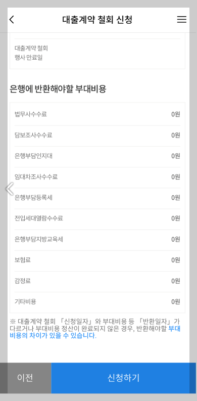 6. 은행에 반환해야할 부대비용이 모두 0인 것을 확인하고 '신청하기'를 클릭합니다.
