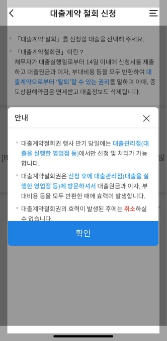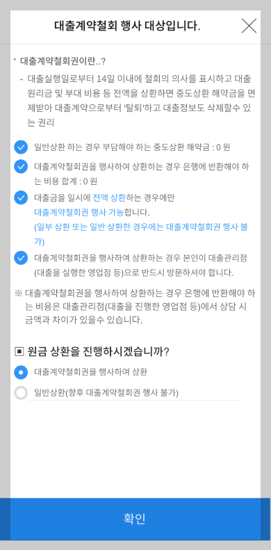 4. '대출계약철회권을 행사하여 상환'을 선택합니다. 대출실행일로부터 14일 이내에 철회하면 대출정보가 삭제됩니다.
