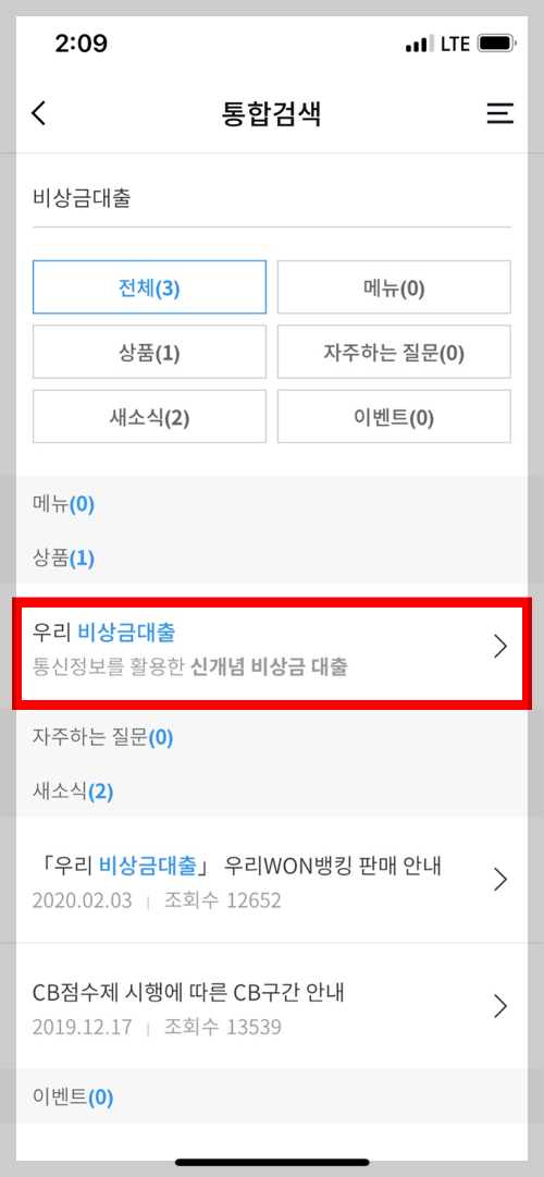 5. 검색결과 중 '우리 비상금대출'을 클릭해 줍니다.
