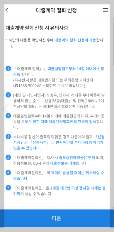 5. 철회 신청 화면의 안내에 따라 '다음'을 클릭합니다.