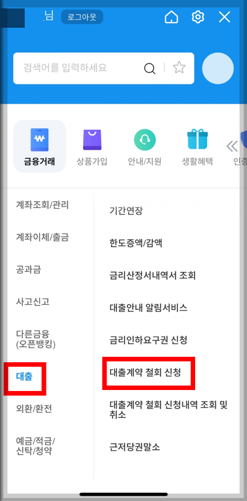 2. '대출' > '대출계약 철회 신청'을 클릭합니다.