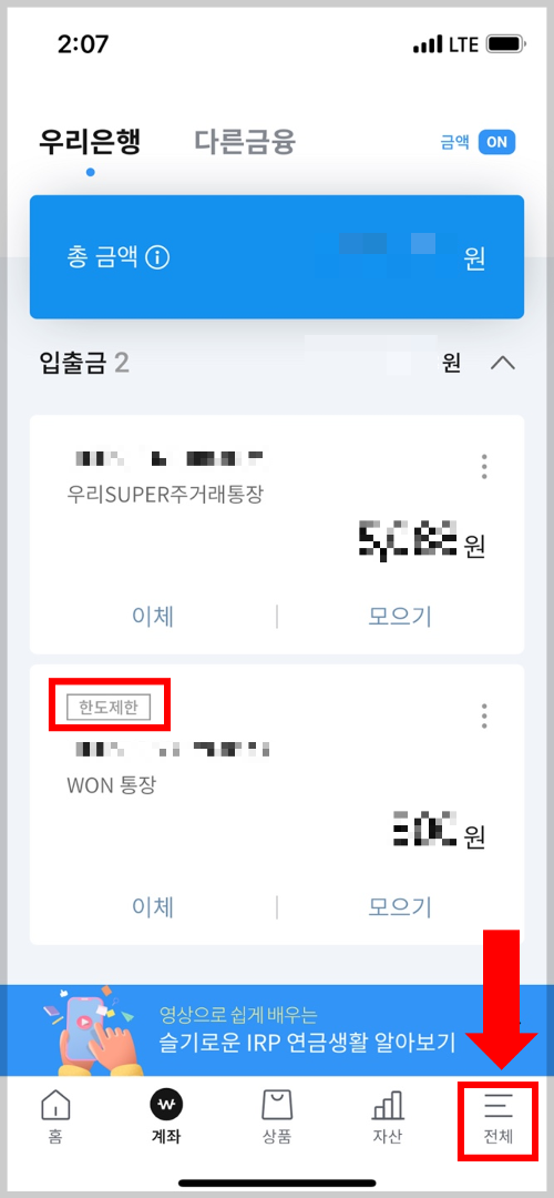2. WON 통장은 '한도제한' 계좌임이 확인됩니다. 우측 하단에 있는 '전체'를 클릭해 줍니다.
