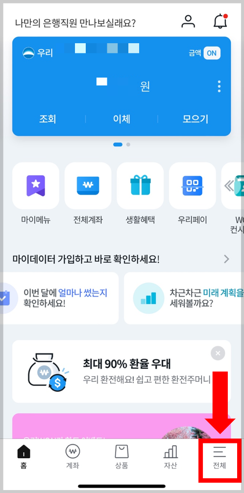 1. 우리WON뱅킹에 로그인 후 우측 하단에 있는 '전체'를 클릭해 줍니다.