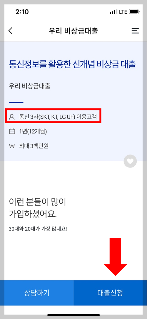 ※ 우리 비상금 대출은 대학생이나 주부 등 수입이 없어도 신청가능하지만 통신 3사 이용 중인 고객만 가능합니다!
