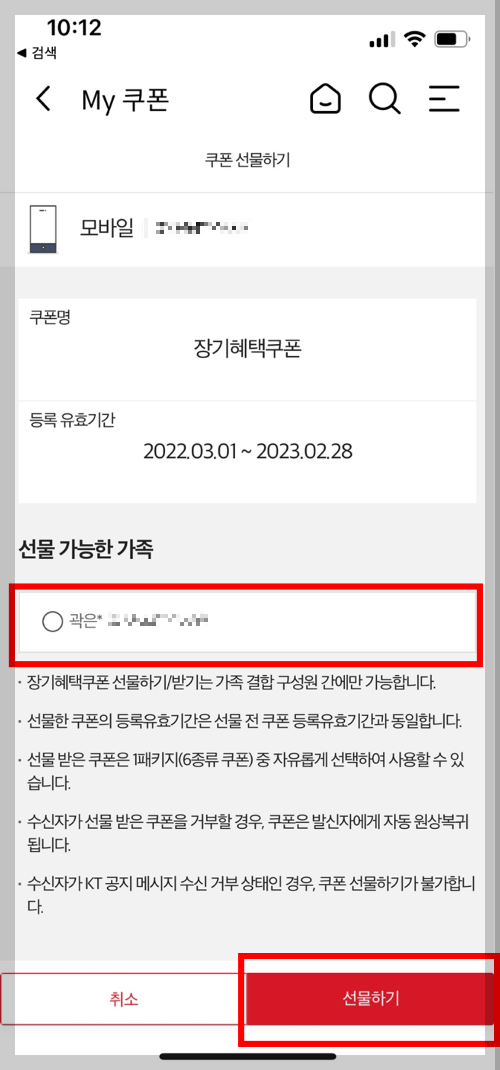 5. 4번에서 [쿠폰선물]을 누르면 KT가족결합 되어 있는 가족구성원에게도 선물할 수 있습니다.