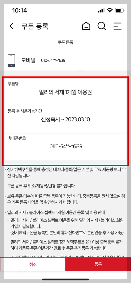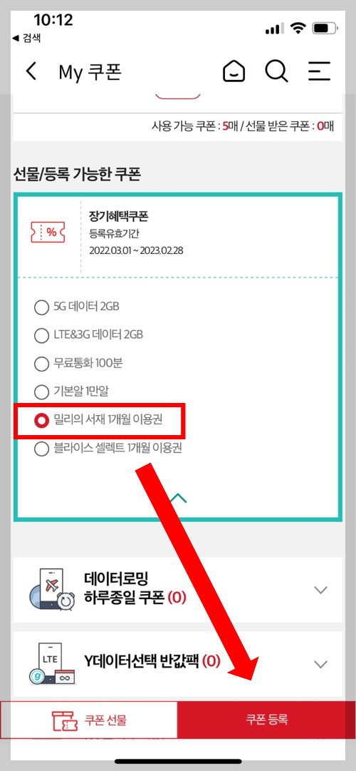 4. 장기혜택쿠폰 내역 중에 [밀리의 서재 1개월 이용권]을 선택하고 등록을 눌러줍니다.