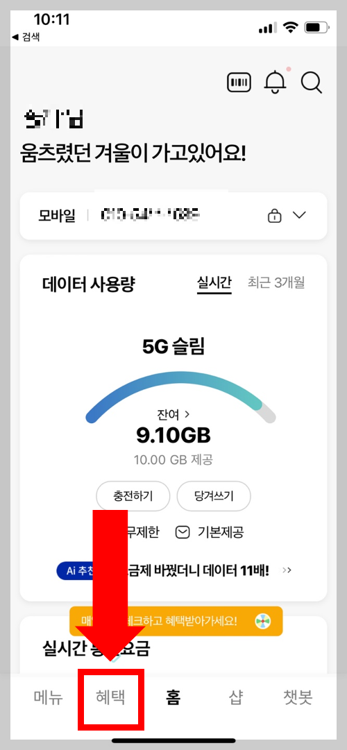 2. 앱에 들어가서 첫 화면 하단에 보면 [혜택]을 클릭해 줍니다.
