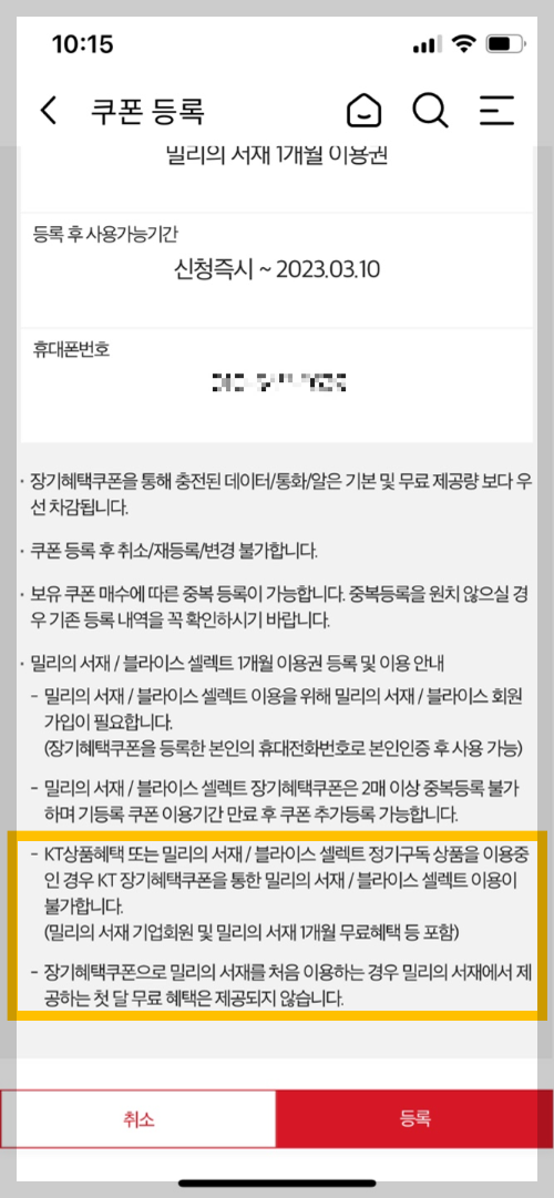 7. 주의사항은 이미 밀리의 서재 정기구독을 이용하고 계시다면, KT장기혜택쿠폰을 통한 밀리의서재 이용이 불가합니다.또한, 장기혜택쿠폰으로 밀리의 서재를 처음 이용하시는 경우에는 밀리의 서재에서 제공하는 첫 달 무료혜택이 제공되지 않습니다. (가입해서 무료혜택 한 달 이용한 후 정기구독 해지 신청하고, KT장기혜택쿠폰 등록해서 사용하시는 걸 추천합니다!)