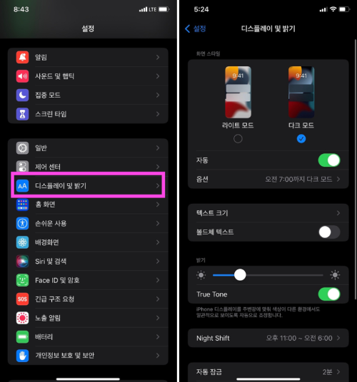 2. [디스플레이 및 밝기]를 열면 [라이트 모드]와 [다크모드]를 선택할 수 있습니다. [다크모드]를 탭하고 [자동]을 활성화시켜 줍니다.