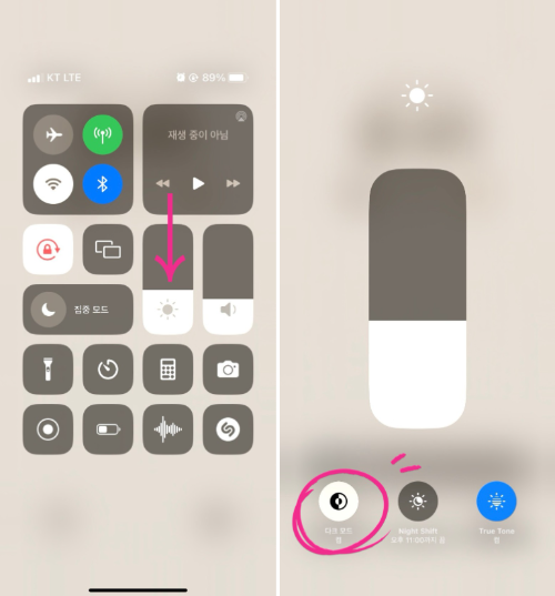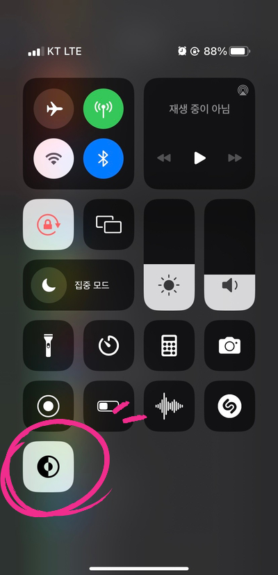 3. 추가 후 제어센터를 내리면 [다크모드] 아이콘이 생긴 것을 확인할 수 있습니다. [다크모드] 아이콘을 눌러 간단하게 전환 가능합니다.