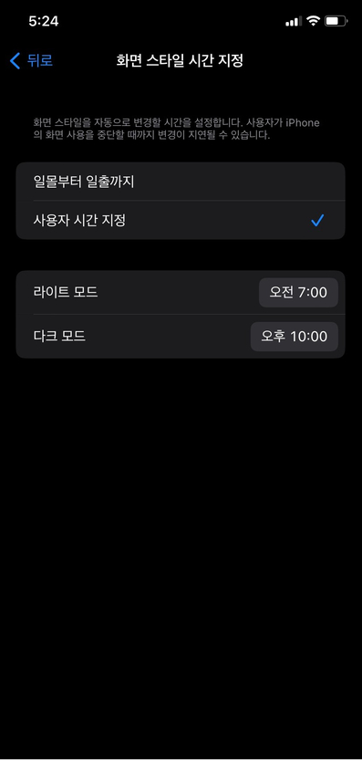 3. [자동]을 탭 하면 기본적으로 일출-일몰 사이에선 라이트모드가 되고, 일몰 후에는 다크모드로 자동전환 됩니다.