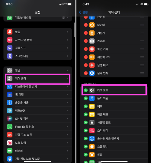 2. [제어센터] → [다크모드]를 탭해서 제어센터 항목을 추가합니다.