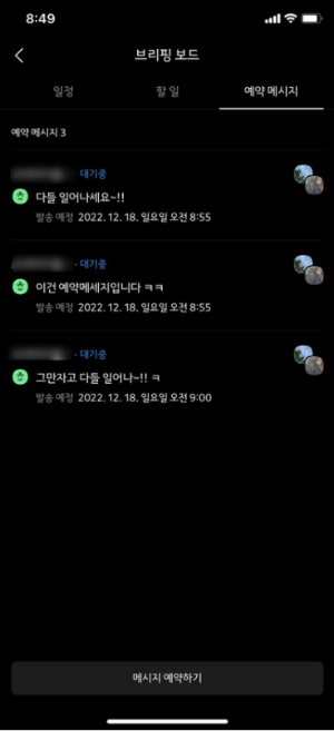 3. 내가 저장한 예약메시지 목록을 확인할 수 있습니다. 취소하고 싶은 메시지를 탭 해줍니다.