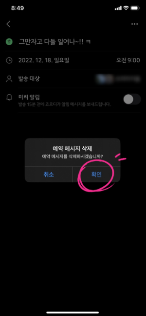 5. 예약메시지를 삭제할 것인지 확인하는 안내멘트가 나옵니다. [확인]을 탭 해주면 메시지가 삭제됩니다.
