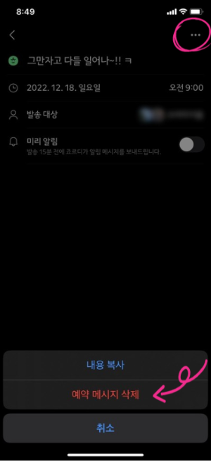 4. 오른쪽 상단에 [ ··· ]을 누르고 [예약메시지 삭제]를 탭 해줍니다.
