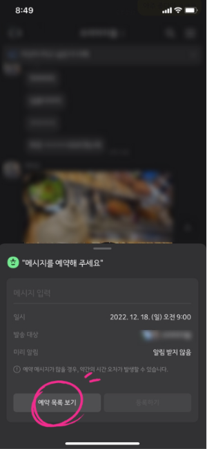 2. 예약메시지 화면이 나오면 왼쪽 하단에 [예약 목록 보기]를 탭 해줍니다.